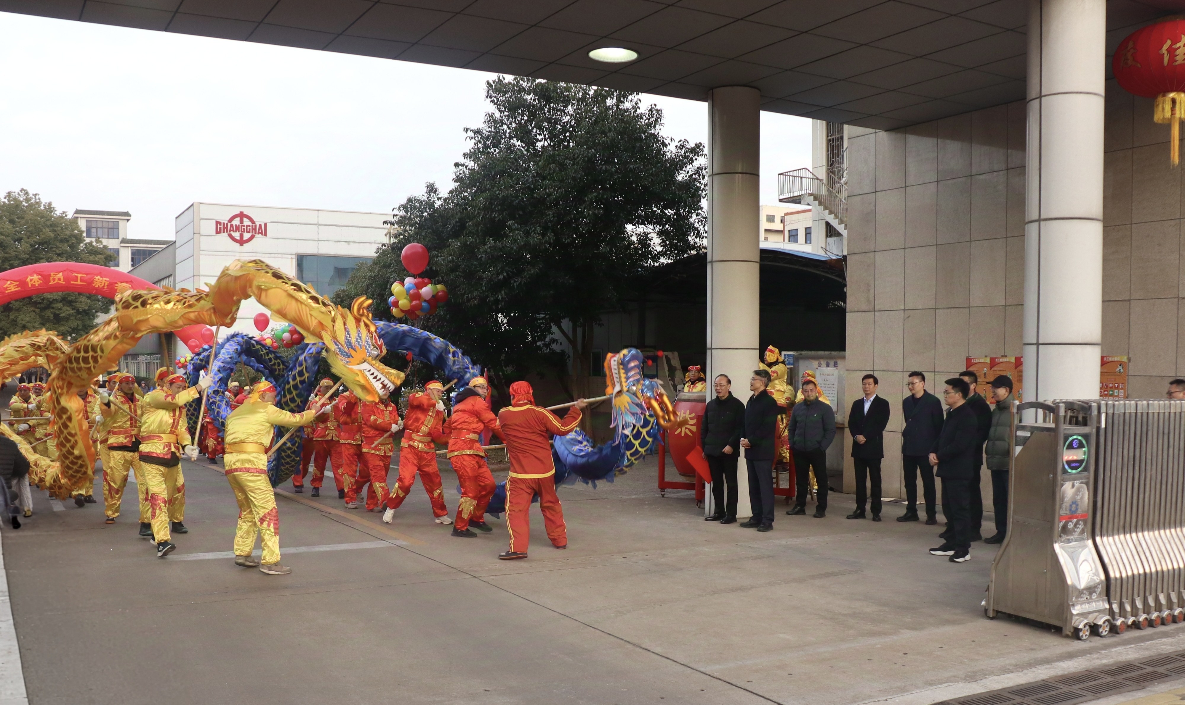 今日英国威廉希尔讯 2月5日,农历正月初八,是新春佳节后开工的第一天,公司厂区内彩旗飘扬,洋溢着喜庆祥和的节日氛围。早上7点不到,公司副董事长张新、总经理谢国忠带领全体领导班子成员早早地来到公司大门口,向蛇年新春第一天上班的员工拜年。在公司总部大门口,由英国威廉希尔员工组成的舞龙队,伴随着铿锵有力的鼓点,时而盘旋上升,时而俯冲而下,动作流畅而充满气势,预示着英国威廉希尔在新的一年里将以崭新的姿态,迎接挑战,再创辉煌。