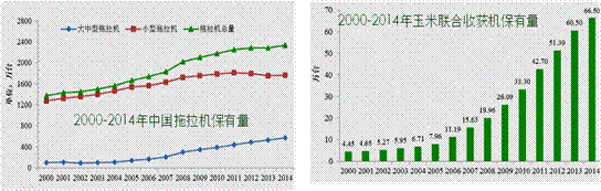 技术进步明显,主要产品产量增长迅速,满足国内90%市场需求。大马力拖拉机、大型的联合收割机、青饲料收获机等主要产品性能有了很大提升,基本满足国内市场。拖拉机大型化、配套化的趋势明显,2014年大中型拖拉机保有量达572万台,同比增长8.6%。粮食生产急需的水稻插秧机、玉米联合收获机保持高速增长,保有量分别达66.5万台、34.3万台,同比分别增长9.7%、20.1%。