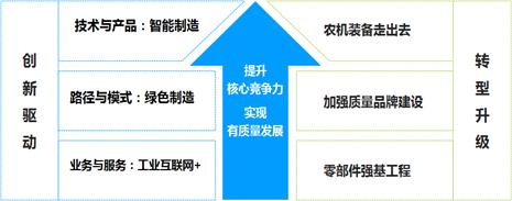 新常态的下农机制造发展思路可以概括为:一条主线,两大核心,六大工程。即以提高农机装备核心竞争力,实现有质量发展为目标,围绕创新驱动和转型升级两大核心战略,重点在技术与产品方面实施智能制造工程,在发展路径与模式方面实施绿色制造工程,在业务与服务拓展方面实施互联网+工程,实施零部件强基工程、质量品牌建设工程,从而推进农机装备走出去。